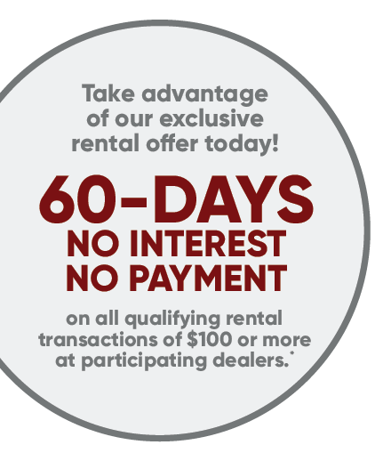 60-DAY NO INTEREST, NO PAYMENT on all qualifying rental transactions of $100 or more at participating dealers.*
